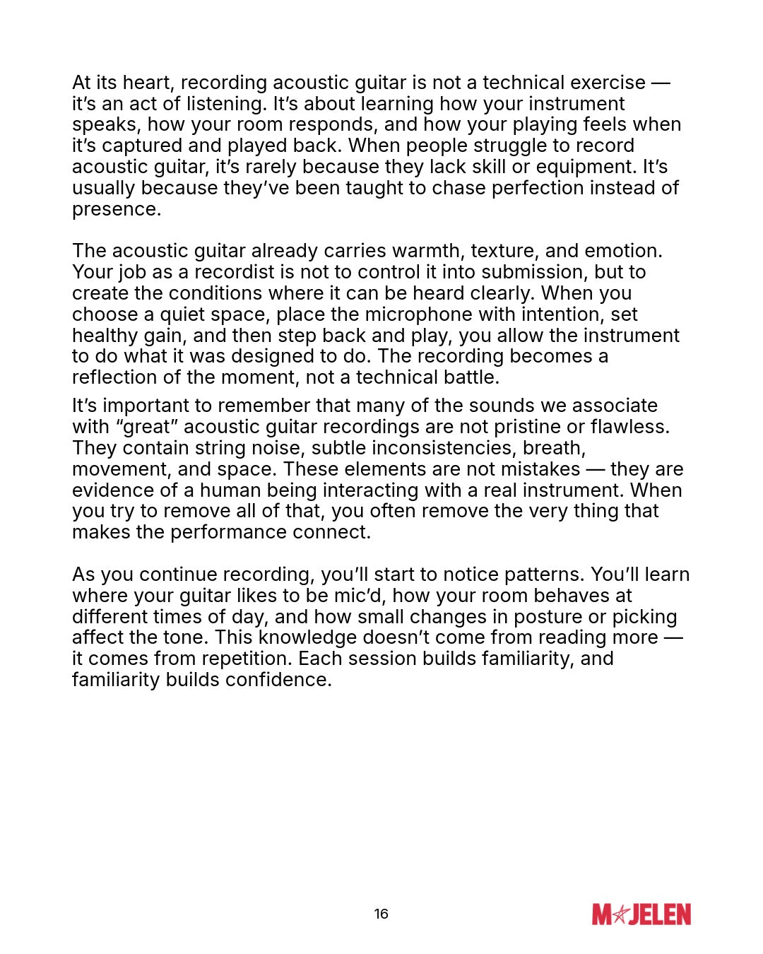 Recording acoustic guitar at home doesn’t have to feel intimidating, expensive, or out of reach. This eBook breaks down the entire process into clear, practical steps that help guitarists of any playing level start capturing great-sounding recordings from home — even with minimal gear and a tight budget. You’ll learn how to work with the space you already have, make smart gear choices, and focus on technique and mindset rather than costly setups. Whether you’re writing demos, releasing music, or just creating for the joy of it, this guide makes home recording feel simple, achievable, and empowering — so you can spend less time second-guessing and more time making music.